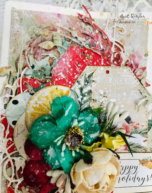 As my usual I first covered the papers with Clear gesso, spread texture paste trough stencil and sprayed some of my favorite colors. After it was dry I started building the composition with paper die-cuts I made with studio75 papers.
